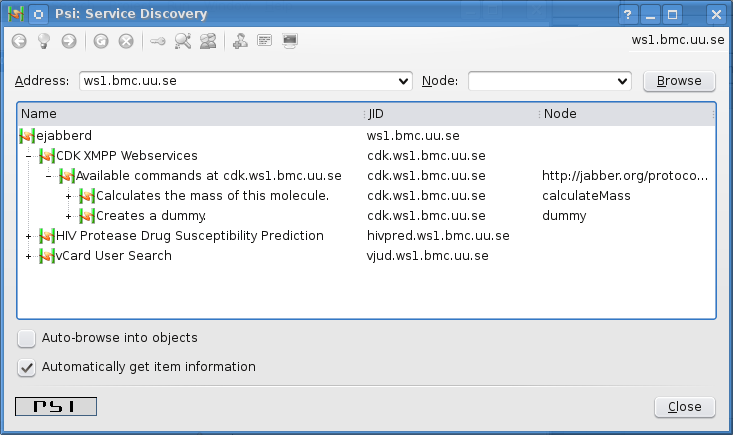Johannes joined a Bioclipse Workshop a long time ago, and introduced the participants to the idea of using XMPP (aka Jabber) for asynchronous web services. SOAP is commonly user to run webservices over HTTP, but via (SMTP) email and XMPP is possible too (see SOAP over XMPP). Using HTTP as transport layer has problems. The biggest problem, is possibly that HTTP connections are timed out, e.g. by intermediate router. This makes it rather unsuited for long running jobs. Workarounds are easy to come up with, and polling is a common solution.