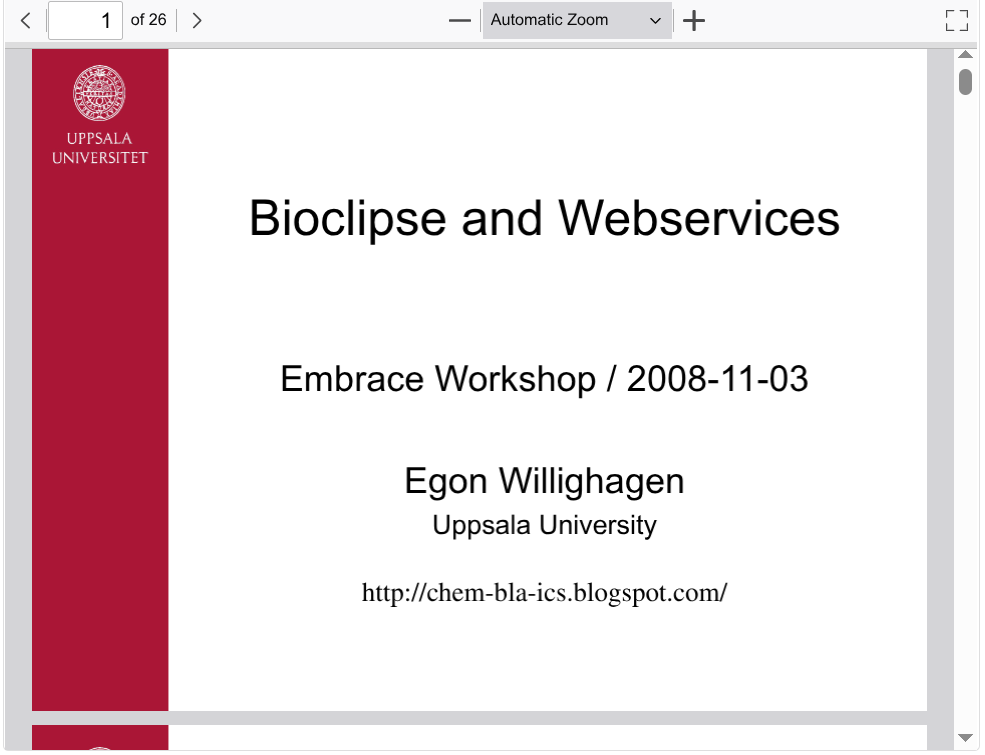 This Monday and Tuesday I will attend the EMBRACE workshop Understanding, creating and deploying EMBRACE compliant WebServices. I will present there the ongoing work in Bioclipse to support services and web services in particular. The sheets of the presentation will look like: