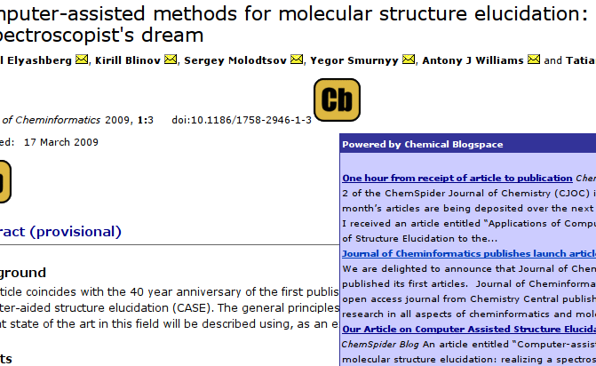 Besides Nature Chemistry , another journal was launched last week (see here and here): the Journal of Cheminformatics. First of all, congratulations to Chris and David for their efforts! While the journal only published one research paper yet, it already found its place on Chemical blogspace. I have two things I want to blog about: data rich publishing, and starting the scientific communication.