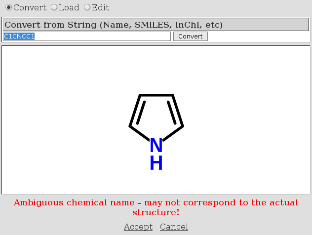 Cheminformatics is difficult, I know. But I thought I used a simple SMILES when I typed C1CNCC1, but ChemSpider got it wrong :) The correct structure should be pyrrolidine, not pyrrole. I always mix up those names, so defaulted to ChemSpider to give me the correct name, which ChemSpider knows and where it also has the SMILES correct… there just seems something wrong with there search dialog: