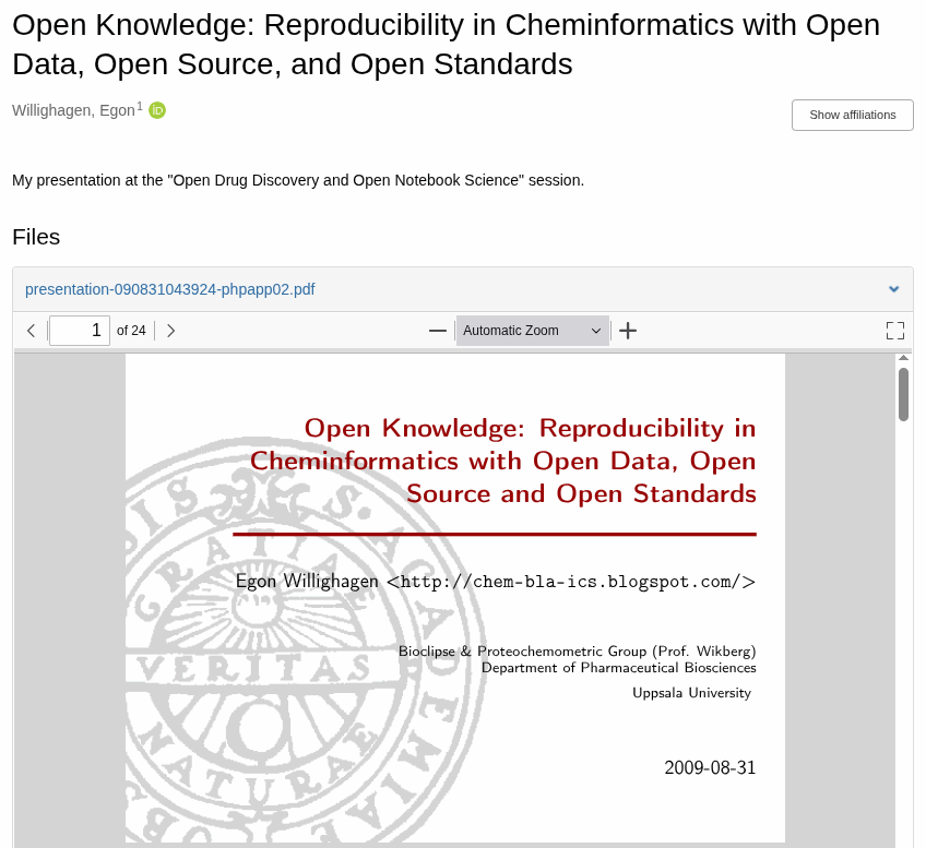 Open Knowledge: Reproducibility in Cheminformatics with ODOSOS https://doi.org/10.59350/t5hgg-stt44 Sep 2, 2009 ~ Mar 7, 2026 Download as: cheminf 10.5281/ZENODO.2652076 Below are the slides of my presentation of last Monday (see my earlier blogs ): This post was originally posted as https://chem-bla-ics.blogspot.com/2009/09/open-knowledge-reproducibility-in.html.