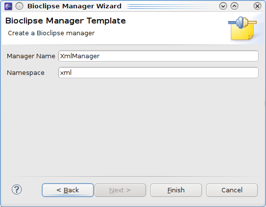 The next wizard page is specific the the Bioclipse manager, and asks a manager namespace, which will be used as prefix in the JavaScript Console.