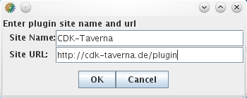 The CDK-Taverna update site is available at http://cdk-taverna.de/plugin/, and we can make Taverna aware of this update site by clicking the Add Plugin Site button: