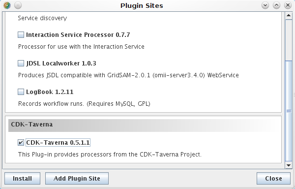 After filling out these values and approving it with the OK button, it will show up on the dialog showing all available plugins, where you need the check the check box in front of the CDK-Taverna plugin name, as done in this screenshot: