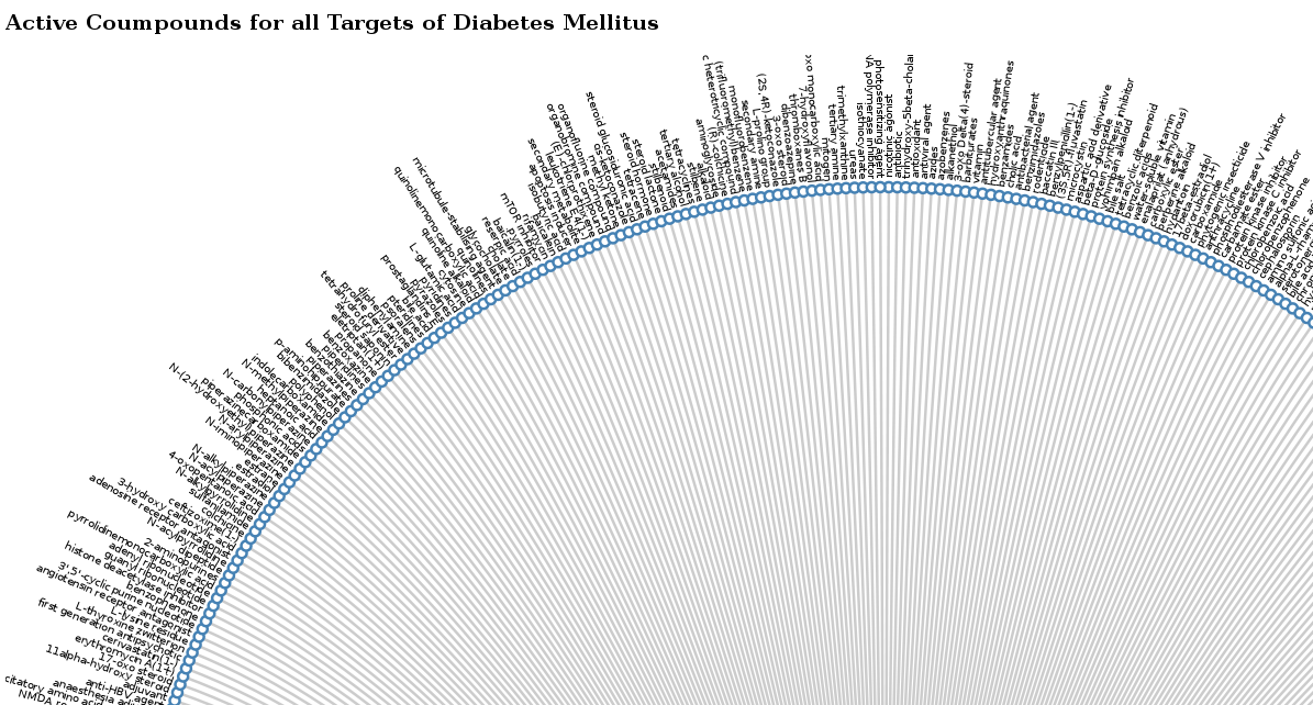The second team (Catherine and Moritz) looked at compounds hitting diabetes mellitus targets. They take advantage from the new disease API methods and first ask for all targets for the disease, and then query for all compounds. Mind you, the compounds are not filtered by activity, so it mostly shows interactions that real targets.
