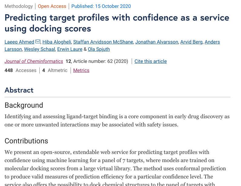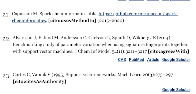 After a time of exploration of technical needs, idea, plans, the Journal of Cheminformatics launched its Citation Typing Ontology (CiTO) Pilot this summer (doi:10.1186/s13321-020-00448-1). I am very excited about this, because the CiTO tells us why we are citing literature. We are a very long way away from publishing industry adoption, but we have to start somewhere. Laeeq Ahmed et al. published a few weeks ago the first research article with CiTO annotation of references (“Predicting target profiles with confidence as a service using docking scores”)!