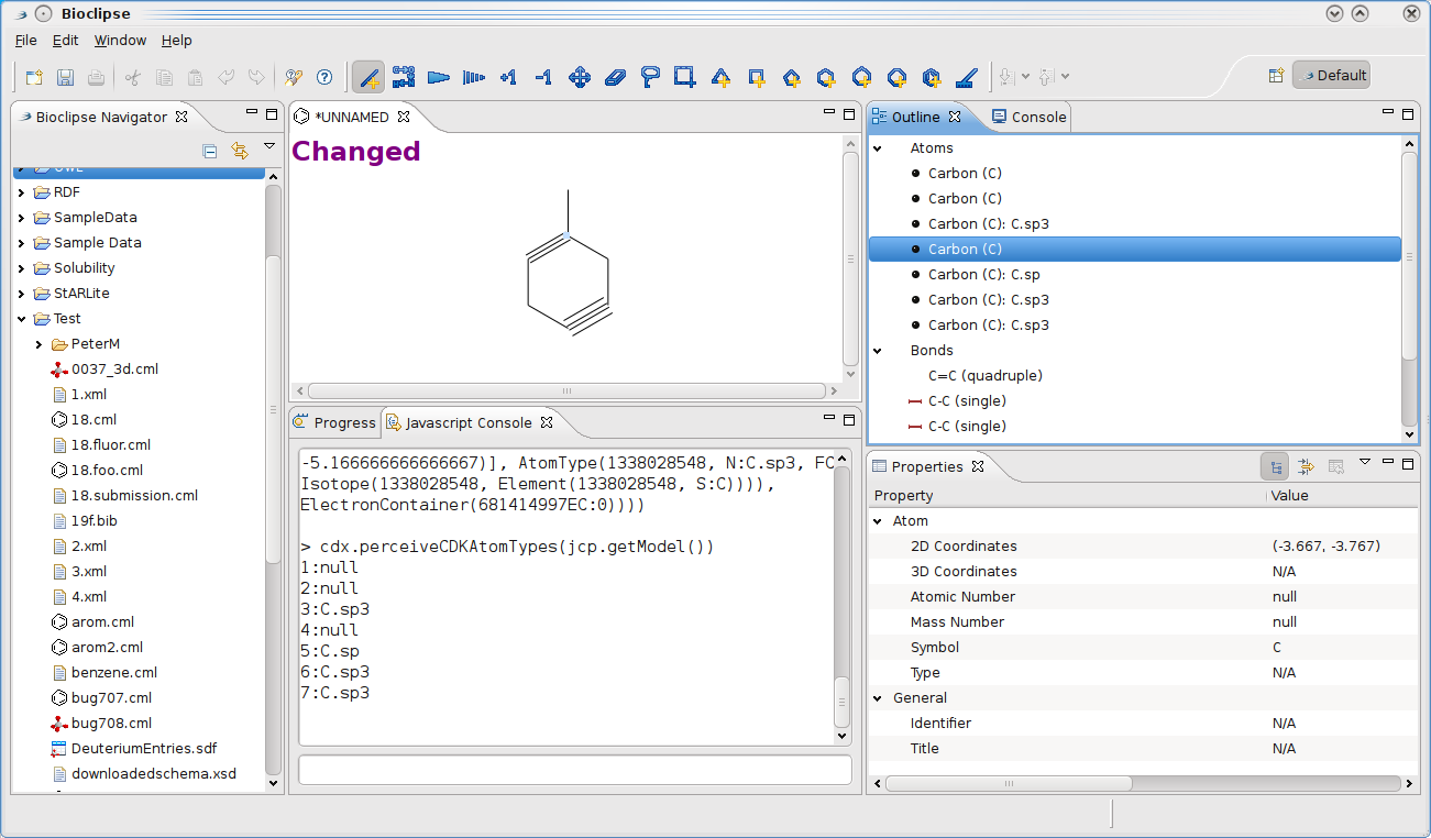 I reported earlier how Bioclipse allows you to use a script to perceive atom types for the content of the JChemPaint RCP editor. This functionality is now available in the outline, and indicates directly if Bioclipse (and the underlying CDK) understands the chemistry you are drawing. In a future Bioclipse release, these problems will be visualized more prominently, likely using the Errors/Problems Views available from Eclipse, or otherwise. -